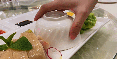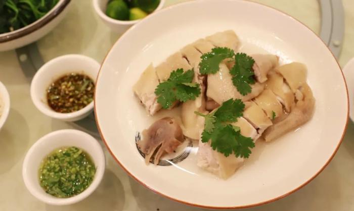 文昌雞被切成大小適中的雞塊兒,整齊地碼放在餐盤上,以薄荷葉為點綴,黃綠相映,甚是喜人。