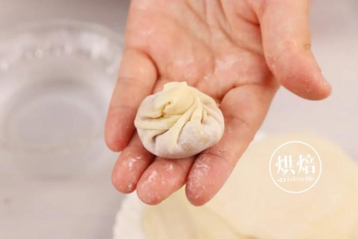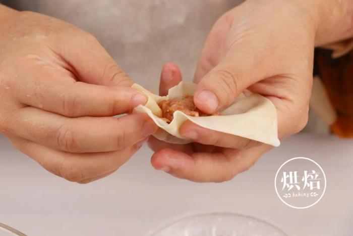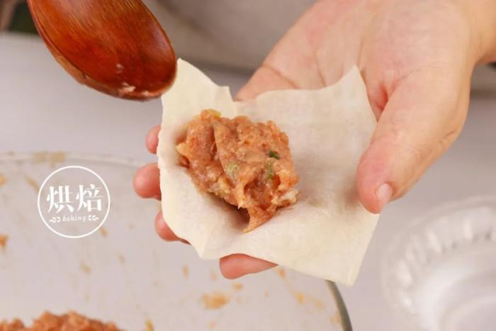 ⑧取市場買來的餛飩皮一片,四邊蘸點水,中間填上肉餡,像包包子一樣收褶口。