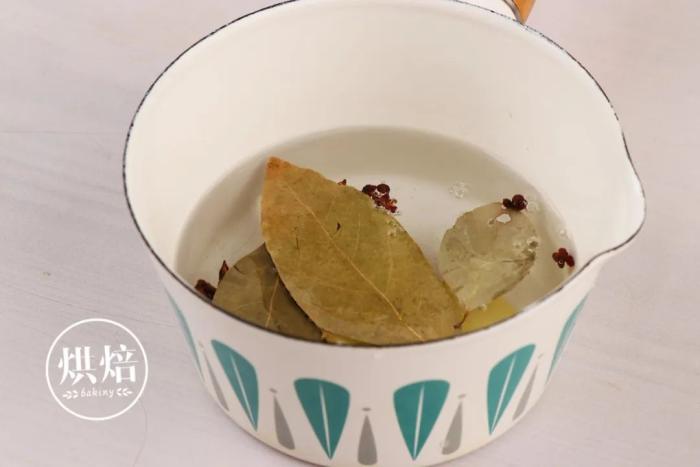 ①準備一個奶鍋,加入250g水,放入香葉,八角,花椒,薑片,開火將水煮開後,撈出香料。