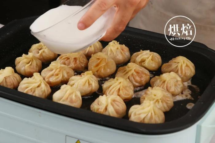⑫準備一個不沾平底鍋,將生煎放在鍋裡,先淋一圈油,蓋上鍋蓋小火煎兩分鐘。