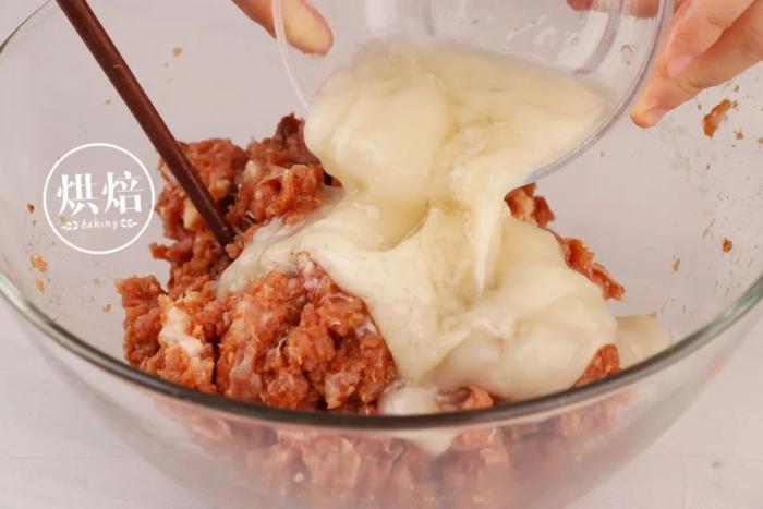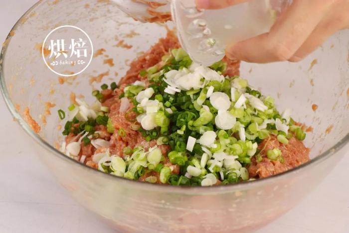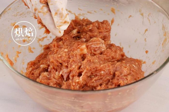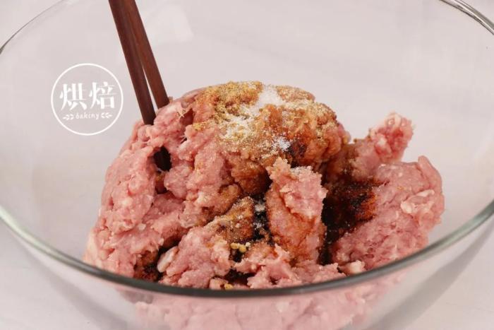 ④將豬肉絞成肉泥,加入鹽,生抽,老抽,胡椒粉,五香粉順著一個方向攪拌均勻。