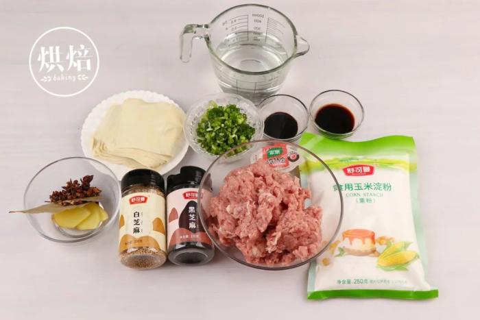 豬肉 500g/濃湯寶 1塊/雲吞皮 1斤/白糖1勺/生抽 2勺/老抽 2勺/五香粉 1勺/胡椒粉 1勺/鹽 適量/色拉油 20g/蔥花 適量/香葉 3片/八角 3顆/薑片 2片/花椒適量